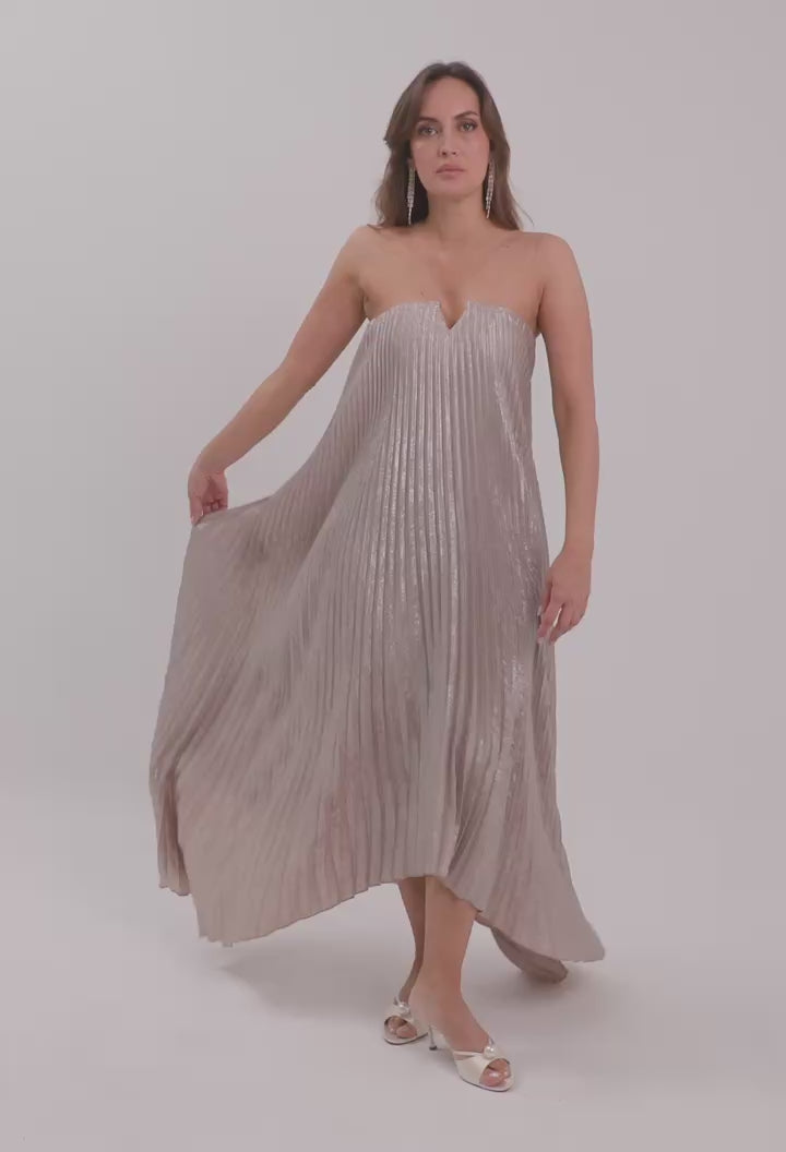 Una pieza deslumbrante diseñada para las noches de gala. Este vestido de silueta amplia destaca por su tejido plisado con detalles brillantes que capturan la luz con cada movimiento. Su corte asimétrico y caída fluida ofrecen una estética contemporánea y etérea, ideal para quien busca una prenda impactante que no marca el cuerpo y mantiene una elegancia absoluta.